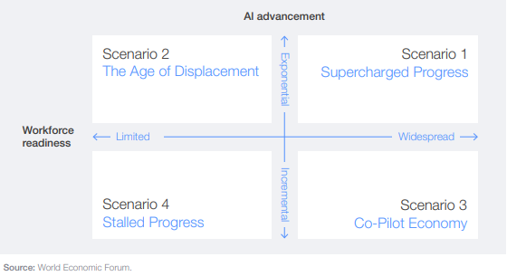 The World Economic Forum identifies four possible futures for jobs by 2030. Supercharged Progress assumes AI and skilled workers drive productivity breakthroughs. The Age of Displacement sees automation outpacing reskilling, raising unemployment risks. Co-Pilot Economy reflects incremental AI integration and human-AI collaboration. Stalled Progress occurs where adoption is limited and skill gaps constrain productivity. Rapid adoption can boost margins but heighten displacement risk, whereas measured integration with reskilling creates new opportunities.