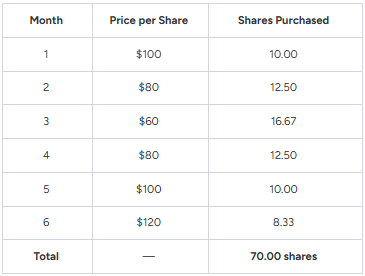 A simplified illustration highlights this effect. Consider an investor allocating $1,000 per month into an equity ETF over a six-month period characterised by price volatility:
