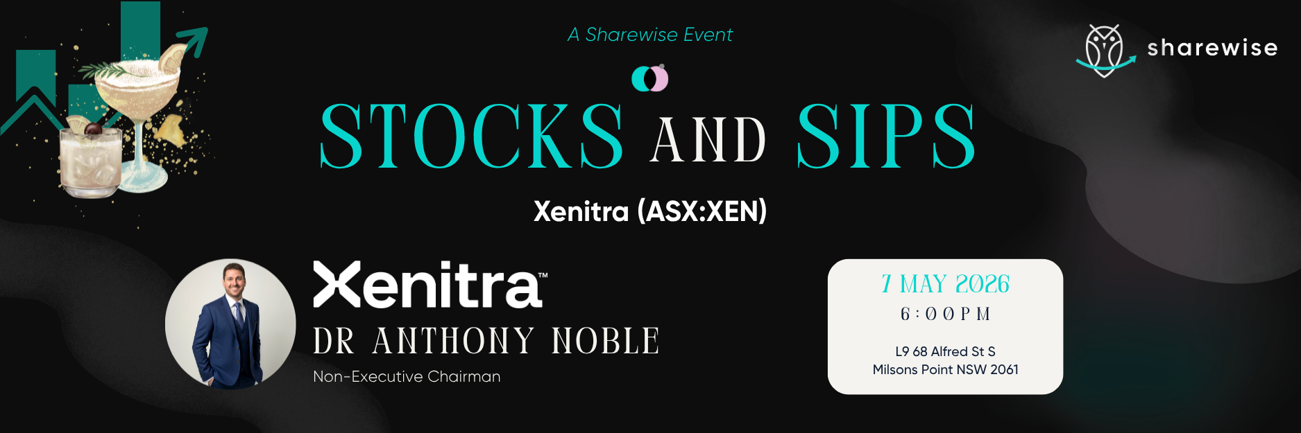Join us on Thursday 7 May 2026 for an exclusive evening with Dr Anthony Noble, Non-Executive Chairman of Xenitra Limited (ASX:XEN). This after-work Stocks and Sips session will provide investors with insights into XEN's strategy across nutraceuticals, OTC pharmaceuticals, and real-world-asset tokenisation, its China market positioning, and upcoming milestones, followed by a live, audience-driven Q&A. Enjoy drinks, gourmet food, and networking in a relaxed setting at the Sharewise office, with complimentary merch to take home.